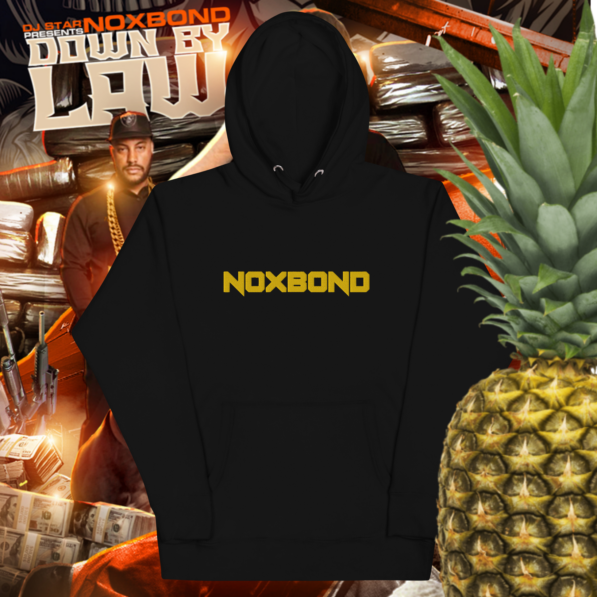 The front is embroidered with NoxBond in an elegant Gold, and the back has the official cover for the album Down By Law hosted by DJ Star. Comes in every color and size! Buy one for you and your loved ones!